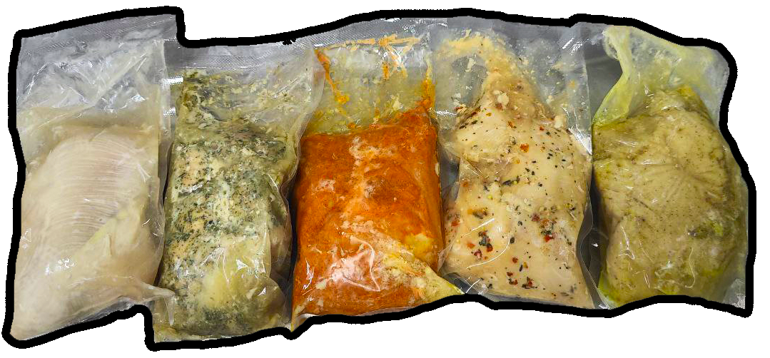 В филе добавляются приправы, соусы и соль, после чего вакуумируется в термостойком пакете.